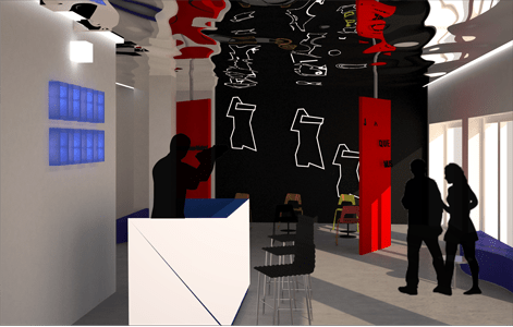 Durante gli eventi organizzati dallo stilista lo spazio si trasforma in un palco per sfilate con vari oggetti di design che riprendono le varie opere nel locale; come ad esempio lampade a forme di abiti o illuminazioni sulle pareti delle forme geometriche utilizzate da lui stesso.