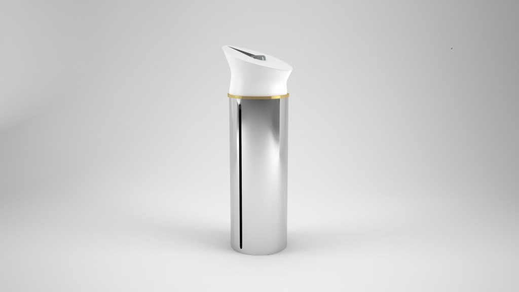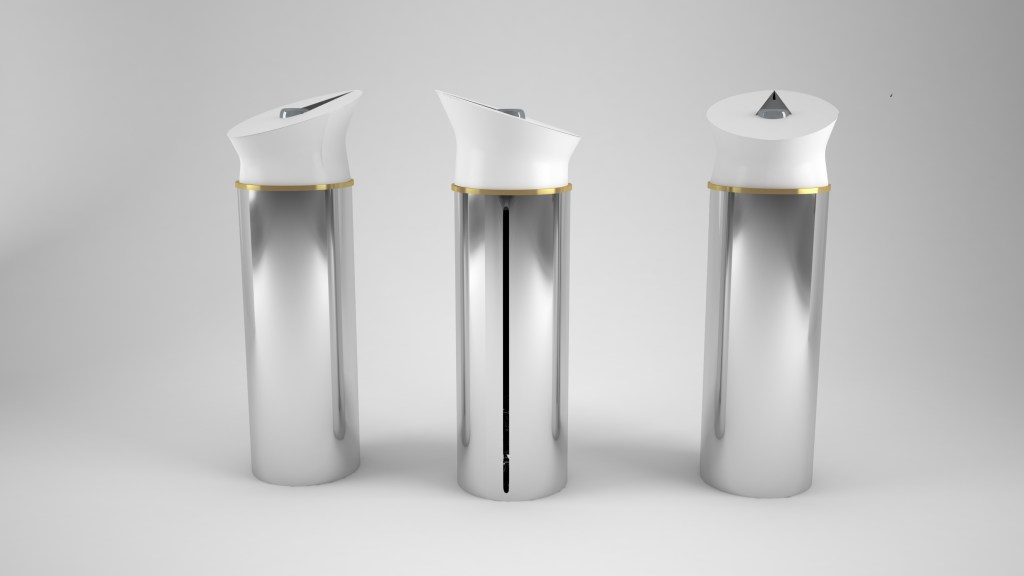 Un’esistente azienda di argenteria di Milano ha richiesto lo studio di un nuovo oggetto per il living. Tramite una ricerca sul consumo delle bottiglie d’acqua in Italia e sulle dimensione delle bottiglie, si è creato un oggetto con la funzionalità di porta bottiglia di plastica. In Italia siamo infatti i maggiori consumatori di bottiglie di plastica; in particolare quelle da un litro e mezzo, poichè sono le più utilizzate per i pasti. La bottiglia viene nascosta all’interno di questo cilindro con la parte inferiore in argento, quella superiore in metallo legate insieme da un bordino di ottone.Sul cilindro inferiore è stata studiata una fessura per mostrare il livello dell’acqua all’interno della bottiglia; mentre nella parte superiore è stato creato un percorso per la discesa dell’acqua quando la bottiglia è inclinata.